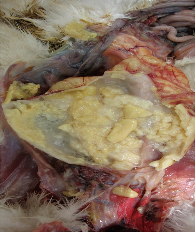 Surnud linnu lahangul ilmneb kõhukelme fibrinoosne põletik ning soolelingudes ja kõhukelmel leidub rebu- ja fibrinoosset massi, mis vastikult haiseb.